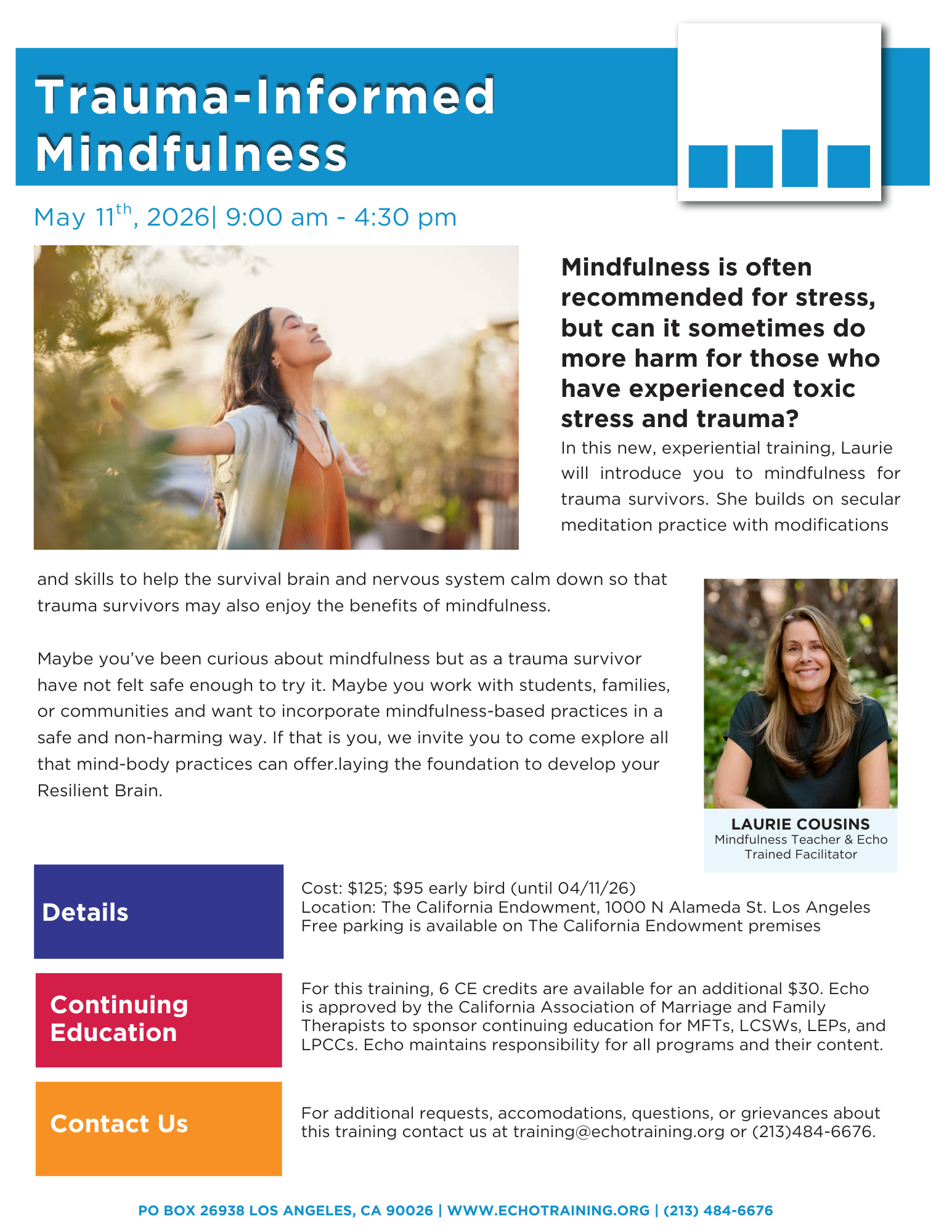 Learn how to integrate mindfulness practices in a safe, trauma-informed way that supports resilience and wellbeing. This experiential training is for educators, community leaders, and trauma survivors. Learn more!